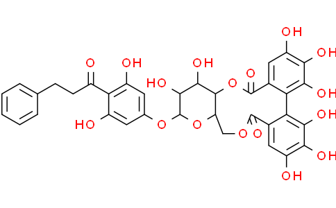 | 英文别名: | Thonningianin B;1-Propanone, 1-[4-[[4,6-O-[[(1S)-4,4',5,5',6,6'-hexahydroxy[1,1'-biphenyl]-2,2'-diyl]dicarbonyl]-β-D-glucopyranosyl]oxy]-2,6-dihydroxyphenyl]-3-phenyl-;13-[3,5-dihydroxy-4-(3-phenylpropanoyl)phenoxy]-3,4,5,11,12,21,22,23-octahydroxy-9,14,17-trioxatetracyclo[17.4.0.02,7.010,15]tricosa-1(23),2,4,6,19,21-hexaene-8,18-dione;SCH 644342;13-[3, 5-dihydroxy-4-(3-phenylpropanoyl)phenoxy]-3, 4, 5, 11, 12, 21, 22, 23-octahydroxy-9, 14, 17-trioxatetracyclo[17.4.0.02, 7.010, 15]tricosa-1(23), 2, 4, 6, 19, 21-hexaene-8, 18-dione;1-Propanone, 1-[4-[[4,6-O-[[(1S)-4,4',5,5',6,6'-hexahydroxy[1,1'-biphenyl]-2,2'-diyl]dicarbonyl]-beta-D-glucopyranosyl]oxy]-2,6-dihydroxyphenyl]-3-phenyl-;DTXSID901100353;AKOS040760825;[3,5-dihydroxy-4-(3-phenylpropanoyl)phenoxy]-octahydroxy-[?]dione;1-[4-[[4,6-O-[[(1S)-4,4',5,5',6,6'-Hexahydroxy[1,1'-biphenyl]-2,2'-diyl]dicarbonyl]-beta-D-glucopyranosyl]oxy]-2,6-dihydroxyphenyl]-3-phenyl-1-propanone;271579-12-5;607391-94-6;LMPK12120466;1-Propanone, 1-(4-((4,6-O-((4,4',5,5',6,6'-hexahydroxy(1,1'-biphenyl)-2,2'-diyl)dicarbonyl)hexopyranosyl)oxy)-2,6-dihydroxyphenyl)-3-phenyl-;Dibenzo[g,i]pyrano[3,2-b][1,5]dioxacycloundecin-9,17-dione, 13-[3,5-dihydroxy-4-(1-oxo-3-phenylpropyl)phenoxy]-11,11a,13,14,15,15a-hexahydro-2,3,4,5,6,7,14,15-octahydroxy-;SCH-644342;DA-78438;1-[4-[[4,6-O-[[(1S)-4,4a(2),5,5a(2),6,6a(2)-Hexahydroxy[1,1a(2)-biphenyl]-2,2a(2)-diyl]dicarbonyl]-I(2)-D-glucopyranosyl]oxy]-2,6-dihydroxyphenyl]-3-phenyl-1-propanone |
